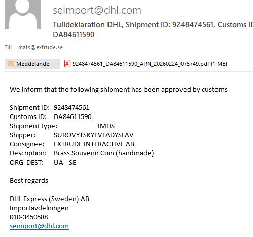 Här är skärmdump från DHLs utskick angående tulldeklaration: